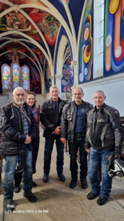 Nous reprenons la route en direction de Neuvy St Sépulchre, situé à une 30 km. Arrivés sur place nous garons les motos et entreprenons de trouver un petit restaurant pour notre repas de midi. “Le Duché” nous accueille, malgré une salle déjà bien pleine et nous profitons d’un menu au rapport qualité/prix étonnant. Après cet excellent repas, nous visitons la basilique, copie du St Sépulcre de Jérusalem, avant de reprendre la route pour notre étape suivante : Le Menoux où nous avons prévu de visiter l’église. Cette église est surprenante du fait des fresques modernes qui la décorent, peintes par Jorge Carrasco, artiste bolivien, entre 1968 et 1976. Cet artiste s’est définitivement installé en Europe en 1968 et il vécut à Le Menoux jusqu’à sa mort en 2006. Son atelier, situé à proximité de l’église se visite également. C'est l’occasion de découvrir les multiples facettes de son talent en admirant quelques-unes de ses sculptures, peintures, aquarelles, et autres techniques qu’il a expérimentées durant sa vie.